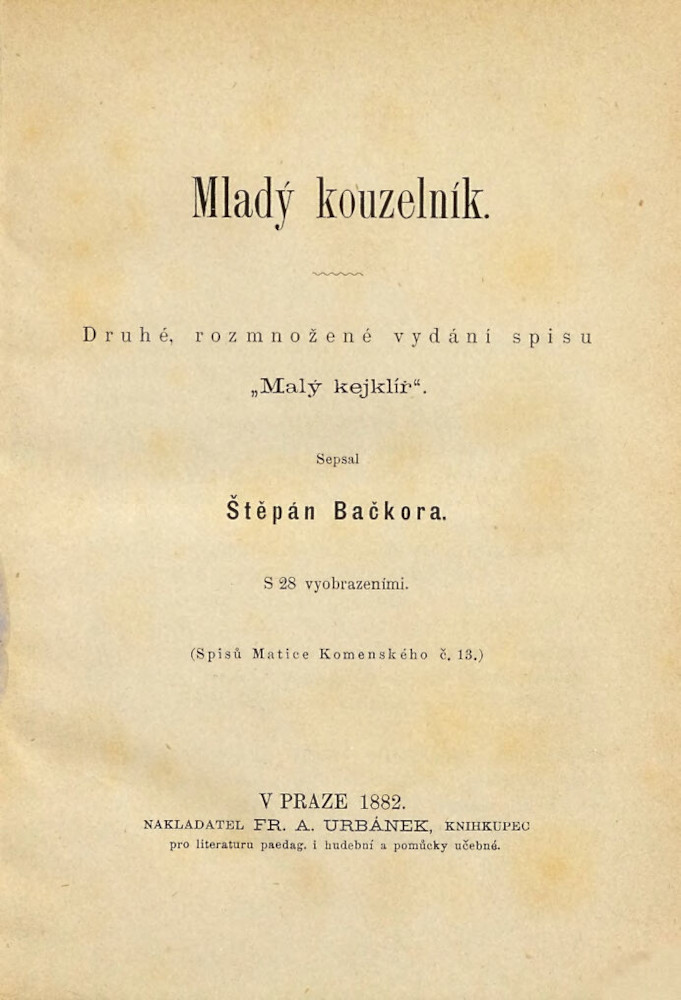 Kouzelníkem slove člověk, který provádí podivuhodné umělecké kousky s neobyčejnou obratností používaje k tomu elektřiny, magnetů, zvětšovacích skel i mnohých přístrojův. Mladý kouzelník touží, aby svými uměleckými kousky mladou společnosť pobavil, mimo to i trochu obdivu vzbudil a náklonnosť si získal. Jsou mnohé kousky umělecké, jimiž mládež v kruhu rodinném takměř bez obtíží a s nevelkými výlohami baviti se může.