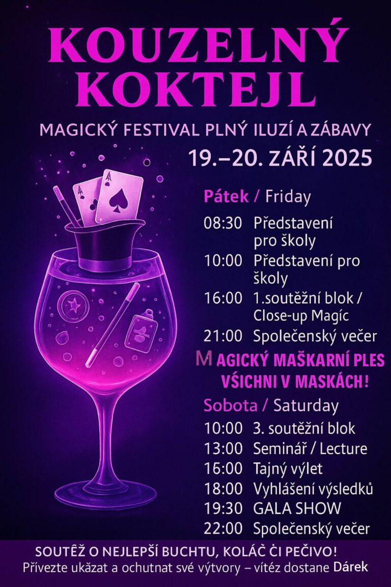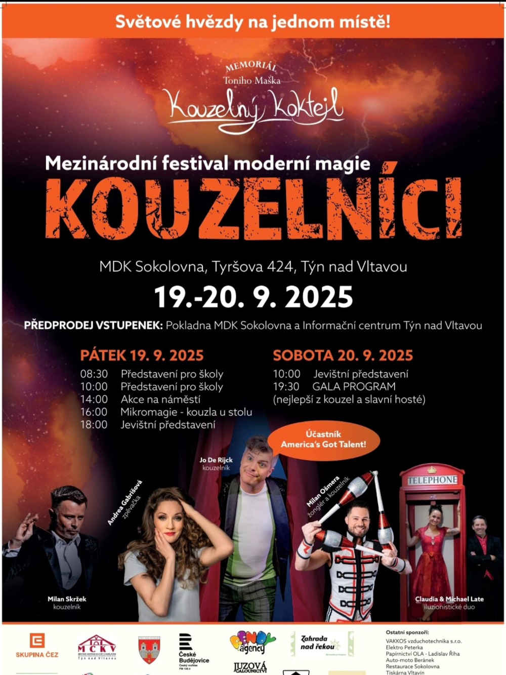 Srdečne vás pozývame na ďalší ročník medzinárodného festivalu Kouzelný koktejl – Memoriál Toniho Maška, ktorý sa koná v priestoroch Městského domu kultury Sokolovna v Týne nad Vltavou. Tešiť sa môžete na maškarný ples, tombolu, tajný výlet a zaujímavých zahraničných hostí: